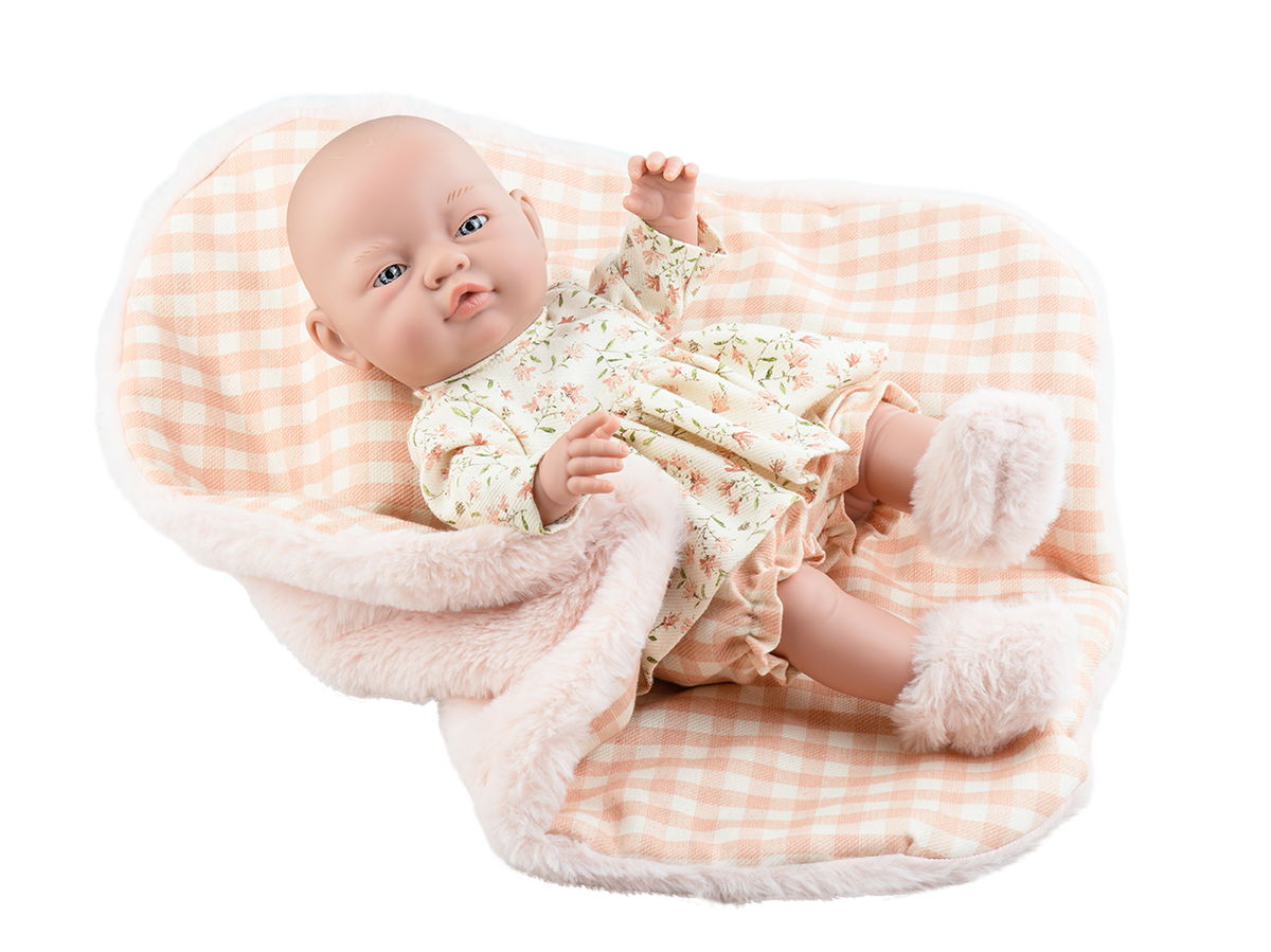 - Materijal od kojeg je napravljen ima mekši dodir i miris koji više podsjeća na bebu. Nosi cvjetnu haljinu i lepršave gaćice. Uključena je i njezina kockasta i čupava dekica.