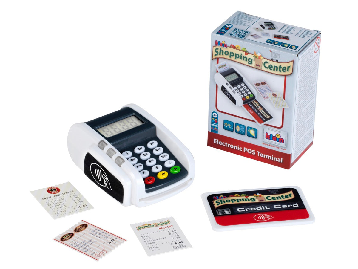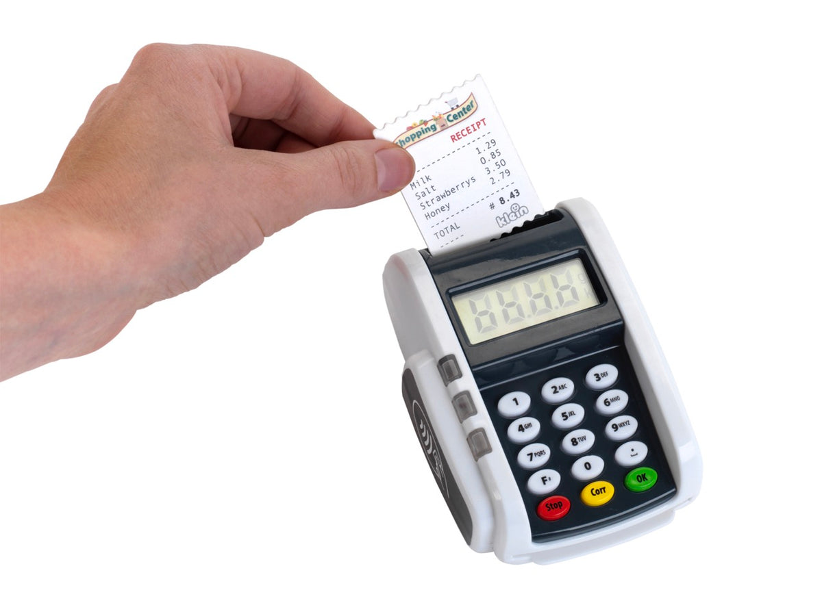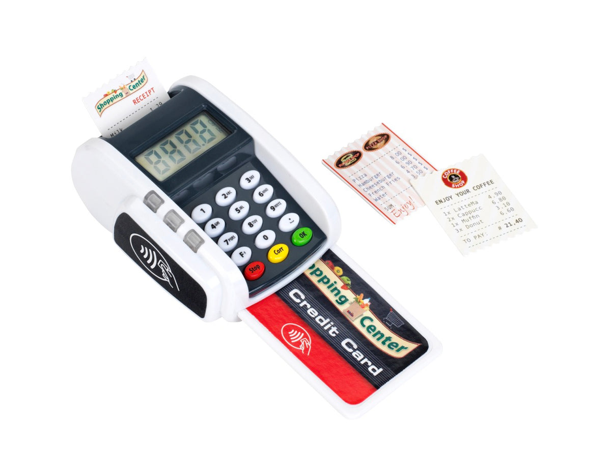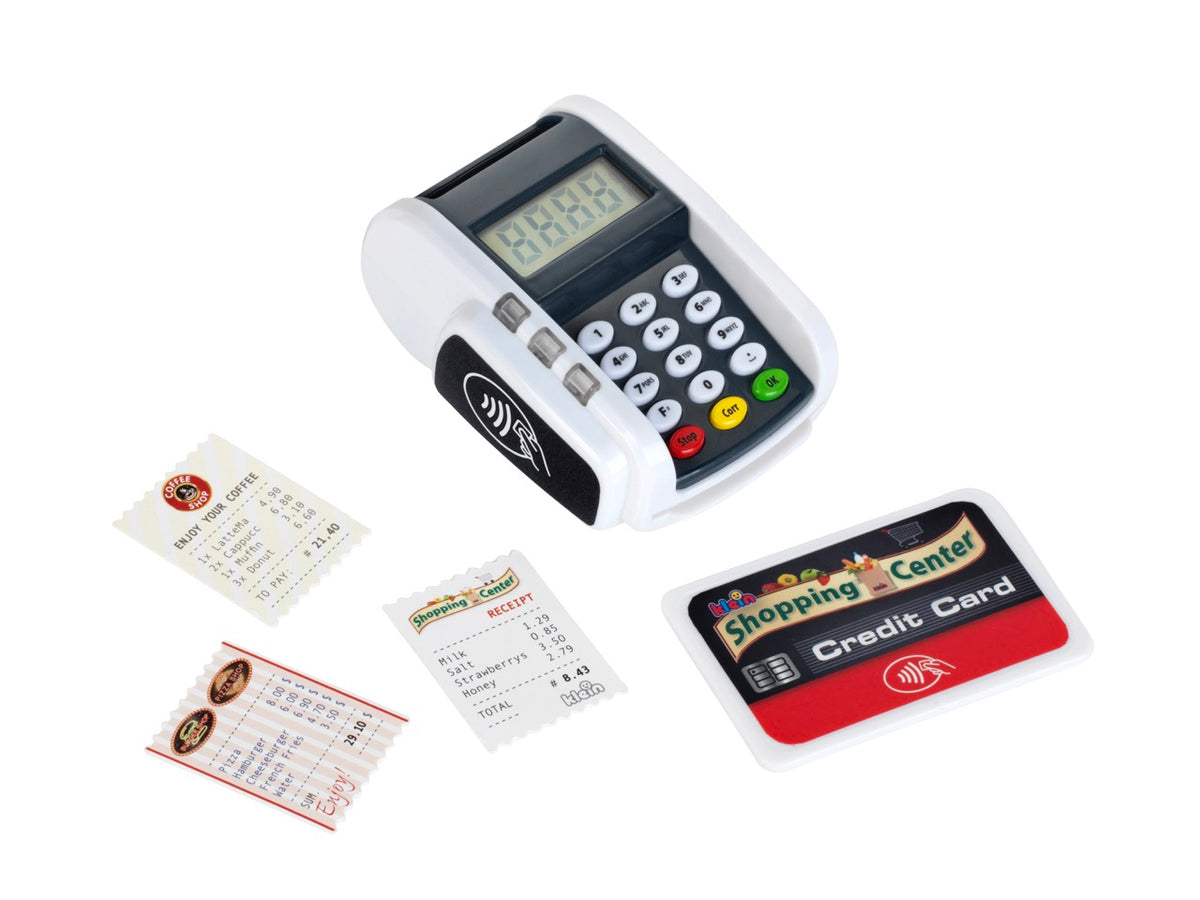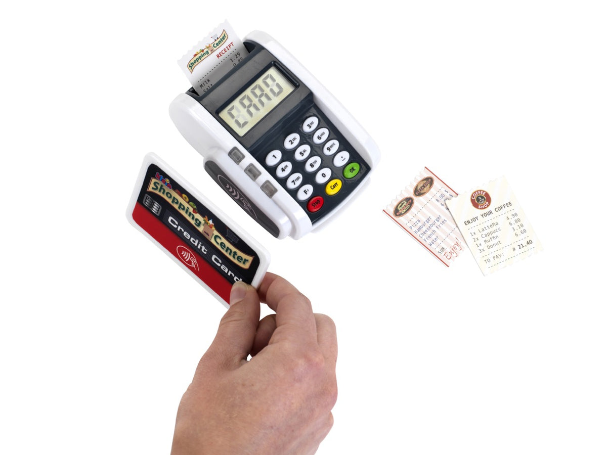 Ovako će se plaćanje odvijati ubuduće - karticama, modernim terminalom i puno zabave. Plaćanje se vrši kreditnom karticom koja emitira prave zvukove kupovine kada se umetne u terminal ili - bez prevlačenja ili dodirivanja - funkcijom beskontaktnog plaćanja: jednostavno unesite iznos, potvrdite, držite kreditnu karticu sa strane terminala, unesite PIN, potvrdite i plaćanje je uspješno. Time ostaje više vremena za ugodne razgovore s kupcima o vremenu, robi i blagostanju, čime se trenira mašta i komunikacijske vještine malih blagajnika.