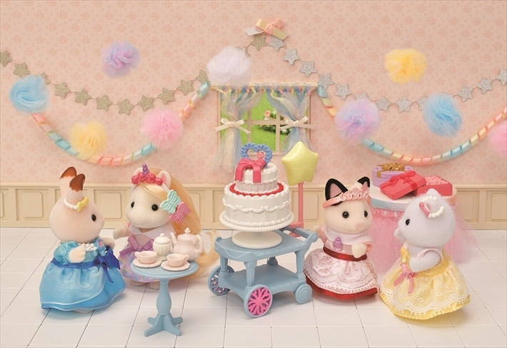 Tuxedo Cat Tuxedo Cat Girl Party set prikazuje Lily u ekskluzivnoj svečanoj haljini, plus raskošnu tortu na dva kata i darove. Također uključuje pribor za ukrašavanje torte. I gornji i donji dio torte možete poslužiti na zasebnim tanjurima. Set za kolače ili čaj može se staviti na kolica radi lakšeg premještanja. Balon zvijezda se može pričvrstiti i na kolica. Alisa vrpca se može nositi uz uključenu figuru ili staviti u poklon kutiju.