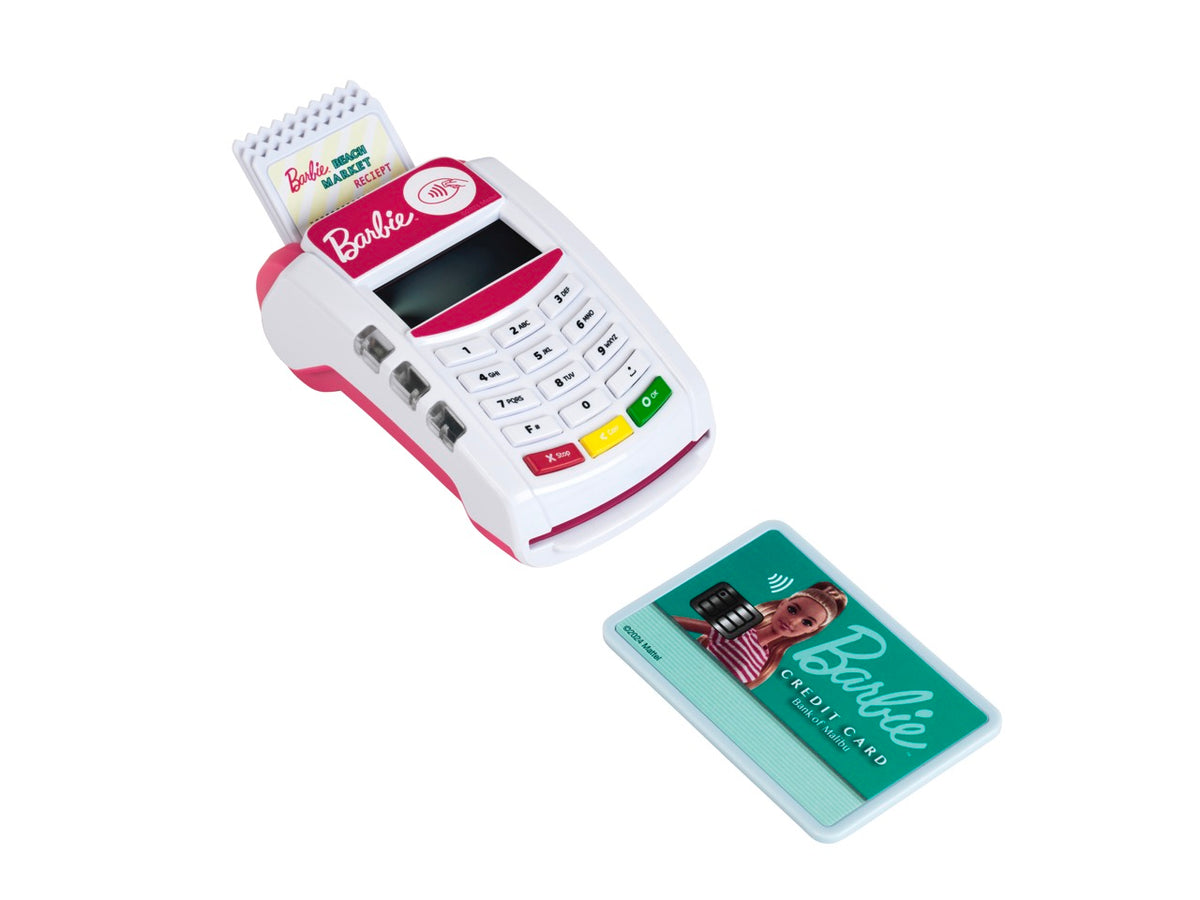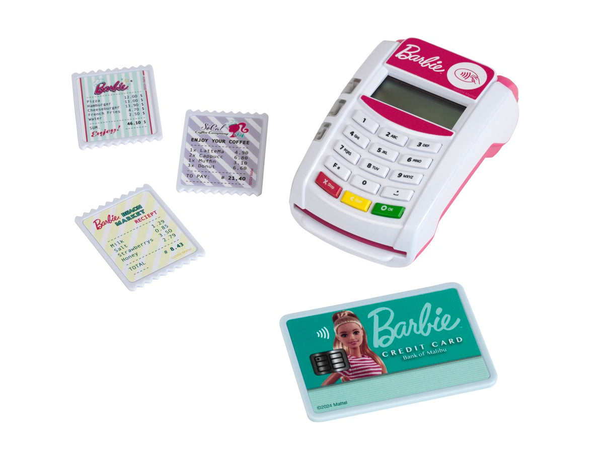 Moderna vremena preuzimaju Barbie svijet: s ovim terminalom za plaćanje u šik Barbie dizajnu, ljubitelji lutaka svih uzrasta sada mogu kupovati sa stilom koristeći super kreditnu karticu bez gnjavaže oko upisivanja koda ili PIN-a. Jednostavno uključe čitač kartica igračke i kada provuku kreditnu karticu kroz utor ili drže Barbie karticu iznad znaka za beskontaktno plaćanje, moderni terminal odgovarajućim zvukom signalizira da je kartica pročitana i prihvaćena. Zatim izdaje račun, poput pravog računa iz blagajne. Tako dječju trgovinu pretvara u šik Barbie butik.
