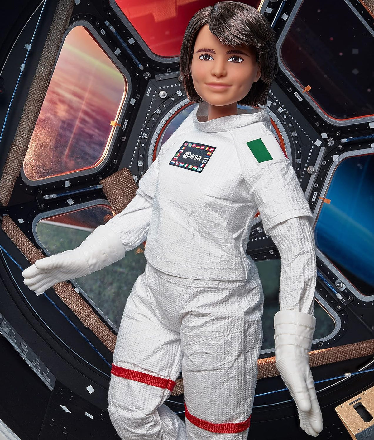 Barbie lutka Samantha Cristoforetti, astronautkinja ESA, spremna je za polijetanje u svom svemirskom odijelu s kacigom i čizmama.