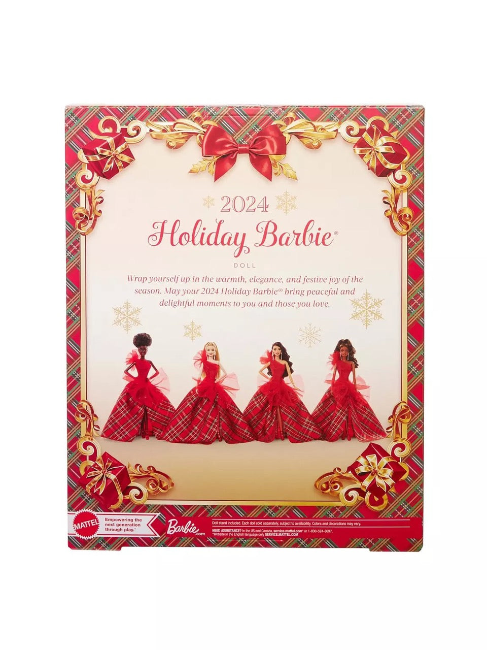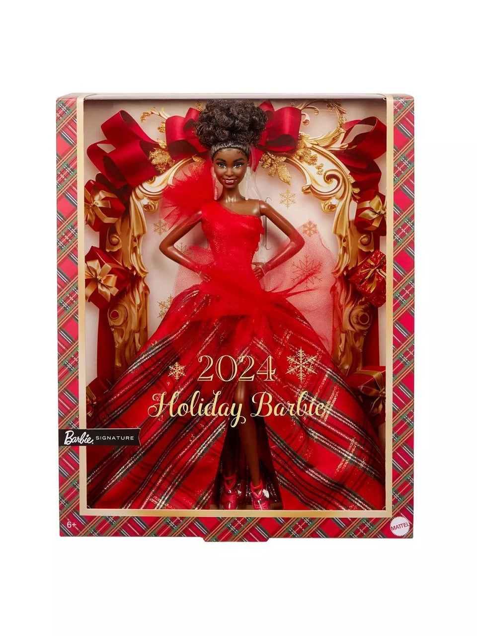 Blagdanska Barbie lutka 2024. zrači toplinom i ljubavlju blagdanske sezone uz svečanu odjeću i svečani izgled! Haljina nudi prekrasnu dramu jer kombinira duboki crveni steznik na jedno rame s punom kariranom suknjom u tutu stilu. Veliki detalji od tila moderan su pogled na klasični izgled.