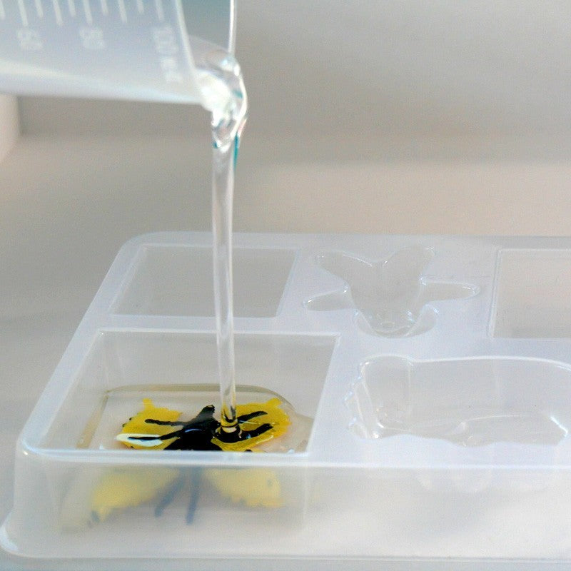 Ova DIY aktivnost savršena je za svakoga tko želi uhvatiti prekrasne uspomene! Suho lišće, školjke ili čak plastične životinje mogu postati prekrasne inkluzije uz pomoć ovog kompleta smole. Djeca će također uživati u ovoj jednostavnoj aktivnosti stvaranja lažnih dijamanata, podmetača i drugih ukrasa za svoju sobu! Nakon pripreme baze od smole, djeca će moći bojati pripravak i uliti ga u različite kalupe prije dodavanja ukrasnih inkluzija. Nakon 24 sata, kada se osuši, prekrasne prozirne ukrase možete izvaditi iz kalupa.