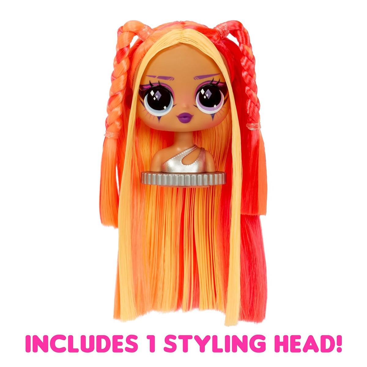 Promijenite Baileyin izgled u trenu tako što ćete njezinu plavu, ljubičastu i ružičastu kosu zamijeniti neonsko magenta i narančastim stiliziranim pokrivalom za glavu koji se lako pričvršćuje na tijelo lutke.