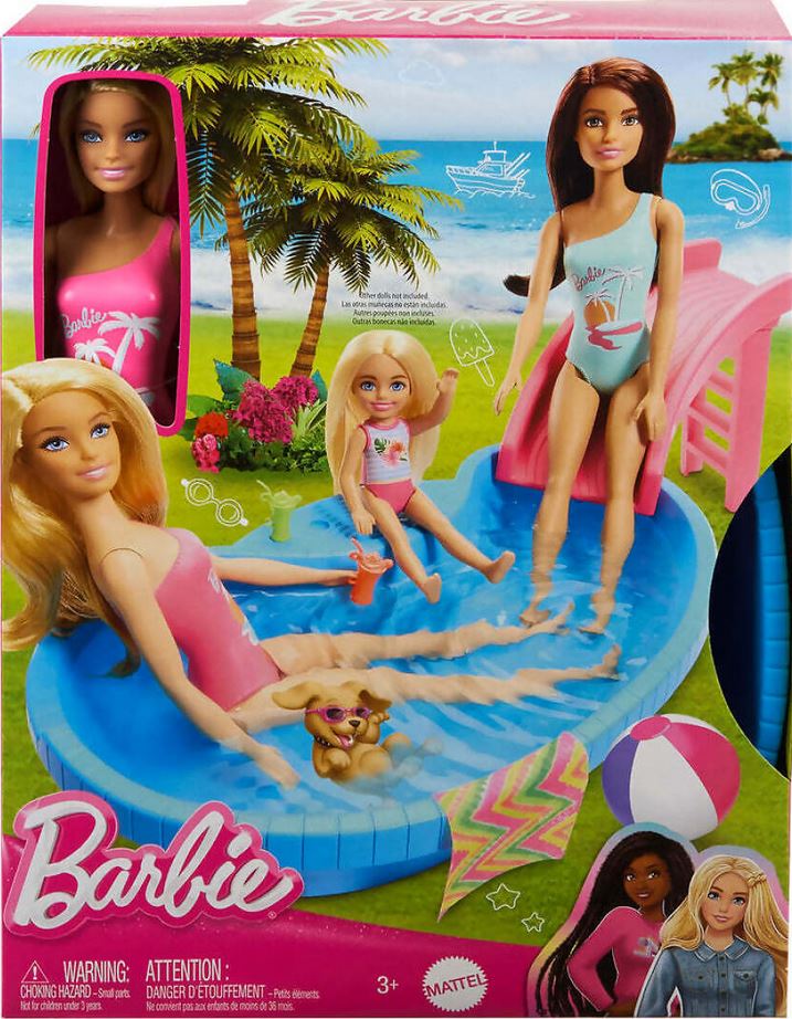 Uključuje 1 Barbie lutku, 1 bazen, 1 tobogan s ljestvama, 1 ručnik i 2 pribora za piće.