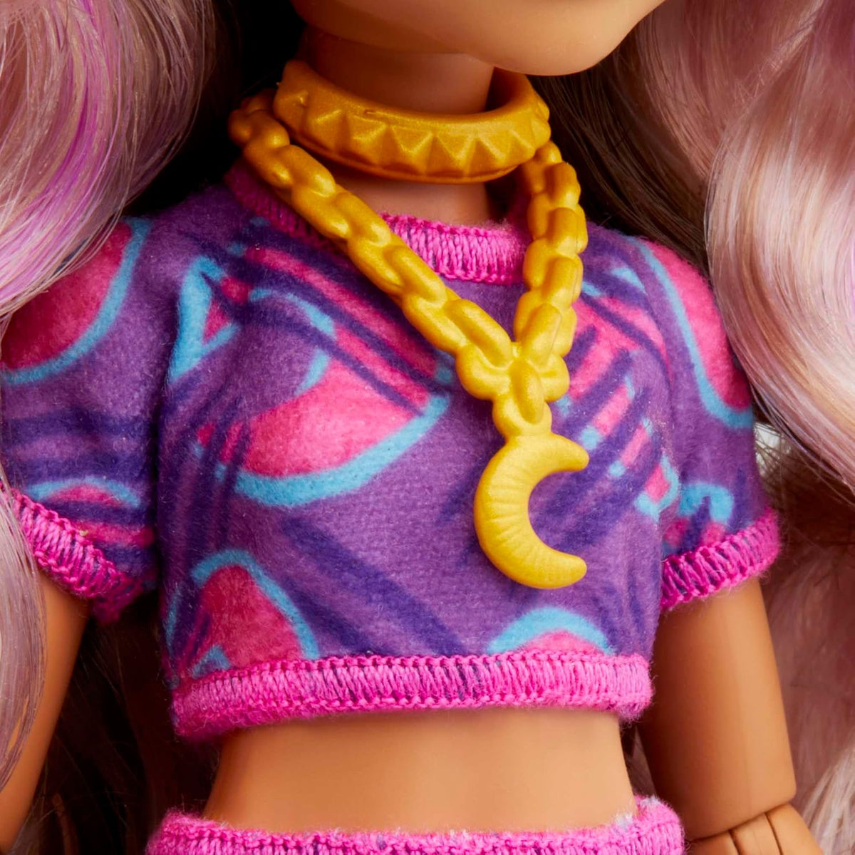 Clawdeen Wolf izgleda zapanjujuće u ljubičastoj suknji i topu s mjesecom i kandžama. Slojeviti ovratnik i čizme od umjetne kože upotpunjuju njezin ultrastrašujući izgled.