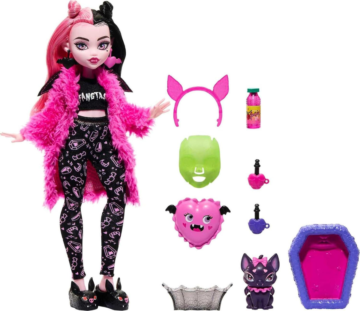- Stilski i tematski dodaci: Draculaura™ lutka ima detaljnu odjeću i dodatke za zabavu tematizirane oko njezine jedinstvene "škara". Njezin mekani kardigan je dirljivo udoban! Nosit će ga preko crop topa i printanih tajica s mrežastim detaljima u struku. Ova vampirica je super elegantna sa svojim svemirskim punđama i neusklađenim velikim naušnicama! Izgled upotpunjuje ružičastom trakom za glavu sa šišmiš ušima i super slatkim šišmiš japankama.
