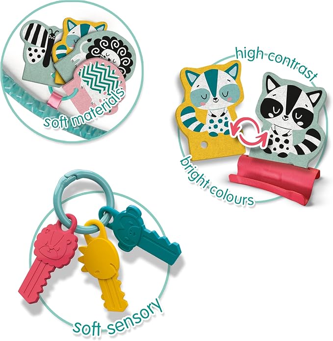 Sense-around prsten za aktivnosti posebno je dizajniran za najmlađe! Vaša beba možda još ne puže, ali otkriva svijet svim svojim osjetilima. Vaša beba gleda svijet velikim očima i sve grize i siše. Puno toga možete otkriti u prstenu za aktivnosti! Prvo, sam prsten. Prsten je lako sastaviti jer jednostavno spojite pojedinačne dijelove. Obruč ima presvlaku od meke tkanine i devet zabavnih omči za igranje i vješanje aktivnosti pomoću spojnih prstenova. Na prsten možete pričvrstiti i tri držača kartica.