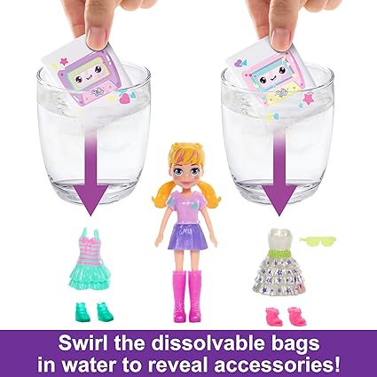 - Djeca mogu otkriti tematska iznenađenja poput lutke Polly Pocket od 7,6 cm za ormarić, papirnatog paketa koji se otapa u vodi kako bi se otkrili dodaci i ekskluzivne kapuljače za lutke Polly!