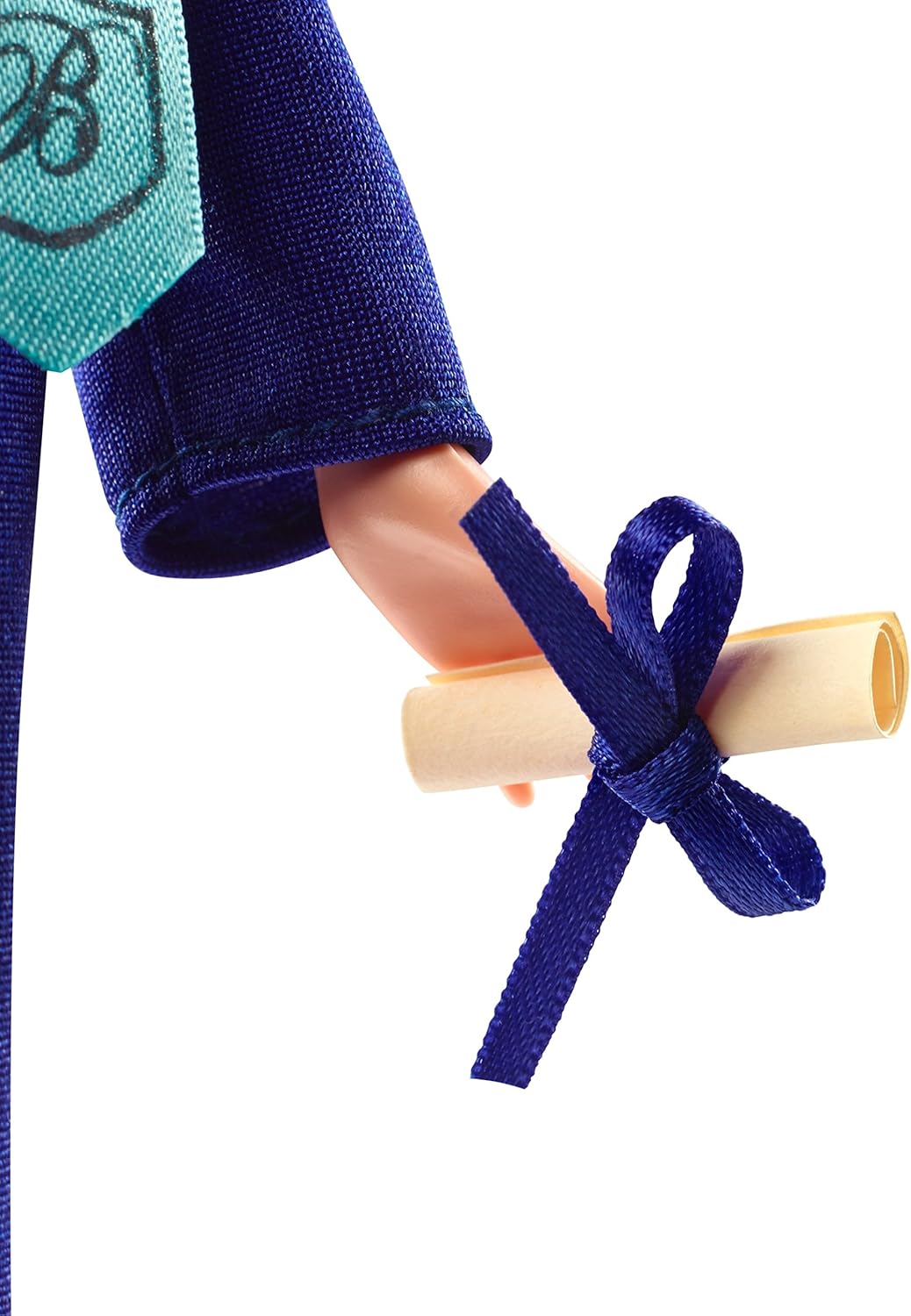 Dodatni detalji uključuju nježnu kapicu na kapici, svijetloplavi maturalni šal i smotanu "diplomu".