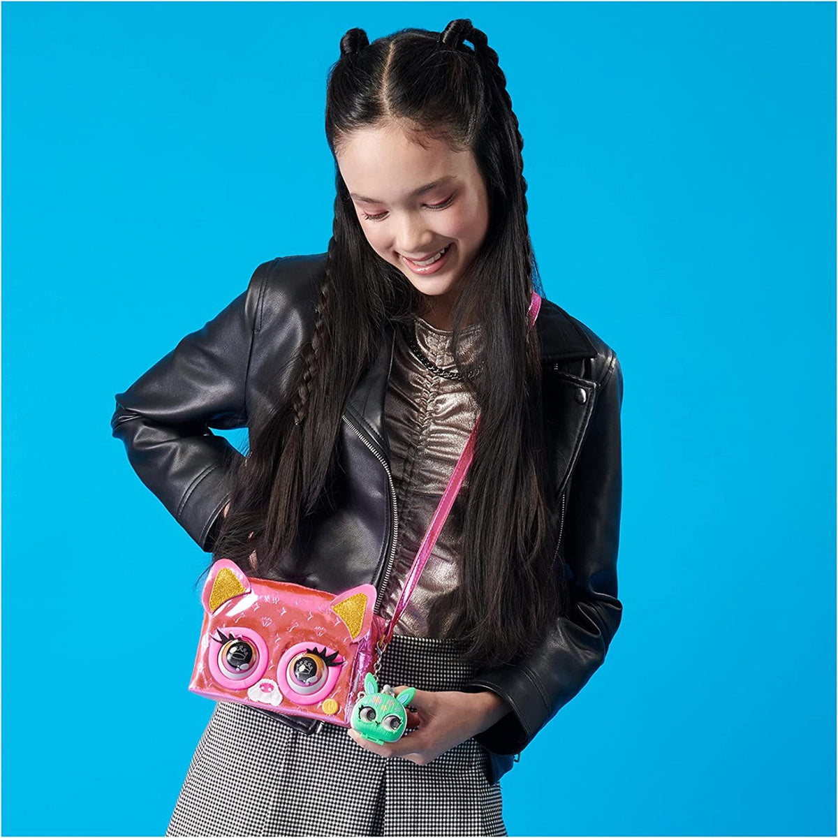 Izrazite svoj stil uz Metallic Magic Purse Pets! Ovi moderni i ljupki interaktivni ljubimci puni su osobnosti. Reagiraju na vaš dodir, trepću u stvarnosti i imaju preko 30 novih uzbudljivih zvukova i reakcija. Flashy Frenchie super je sjajna, s ružičastim reljefnim monogramom, zlatnim šljokicama na ušima, očima inspiriranim pop artom, metalnim dijelovima i podesivim metalnim remenom koji se može nositi preko ramena ili kao torba za nošenje preko ramena.