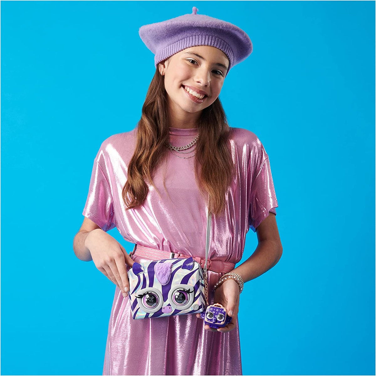Moda nikada nije bila tako živa! Torbica Kućni ljubimci nisu samo torbice i nisu samo kućni ljubimci. Nezaobilazan su modni dodatak za male fashionistice. Rebel Stripez ima bogatu ljubičastu i metalik zebrastu boju, obje s očima inspiriranim pop-artom, metalik okovom i podesivim remenom za nošenje preko ramena ili kao nošenje preko tijela. Purse Pets trepću i ispuštaju zavodljive zvukove dok komuniciraju s vama. Prislonite ih na čelo i brzo će zabljesnuti i čut ćete zvuk poput kamere. Pritisnite gumb simbola za otključavanje više načina igre.