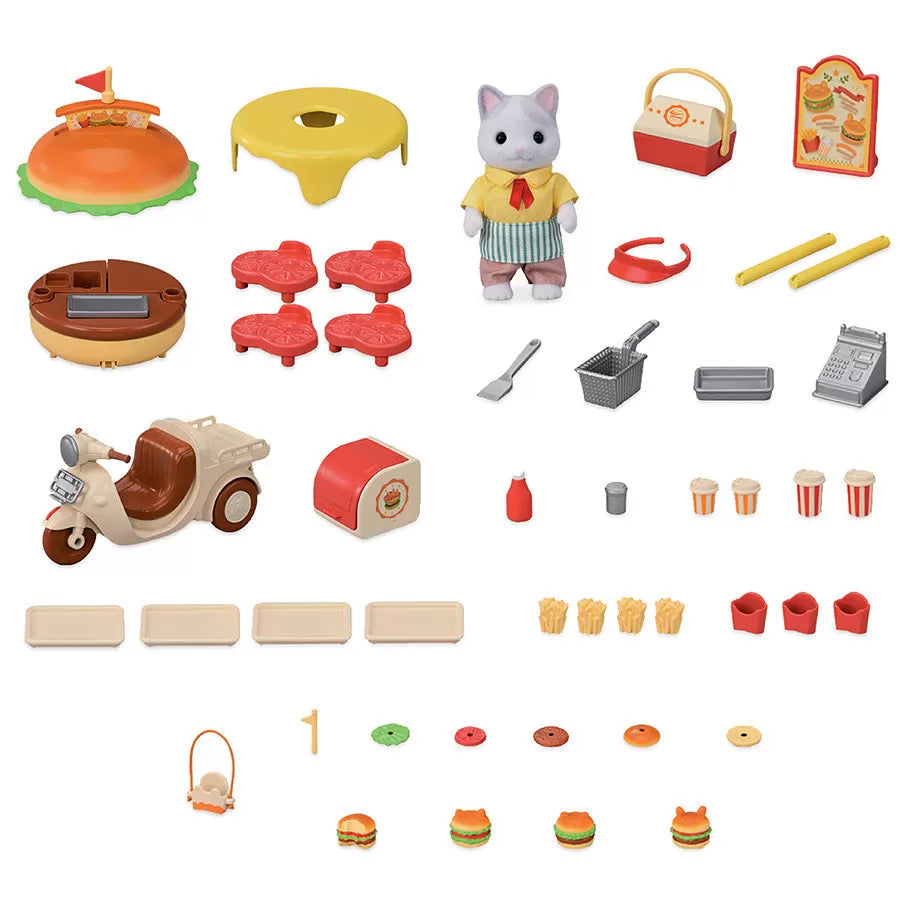 Set Štand s hamburgerima sadrži trgovinu s hamburgerima u obliku hamburgera, dostavno bicikl i tatu Latte Cat.