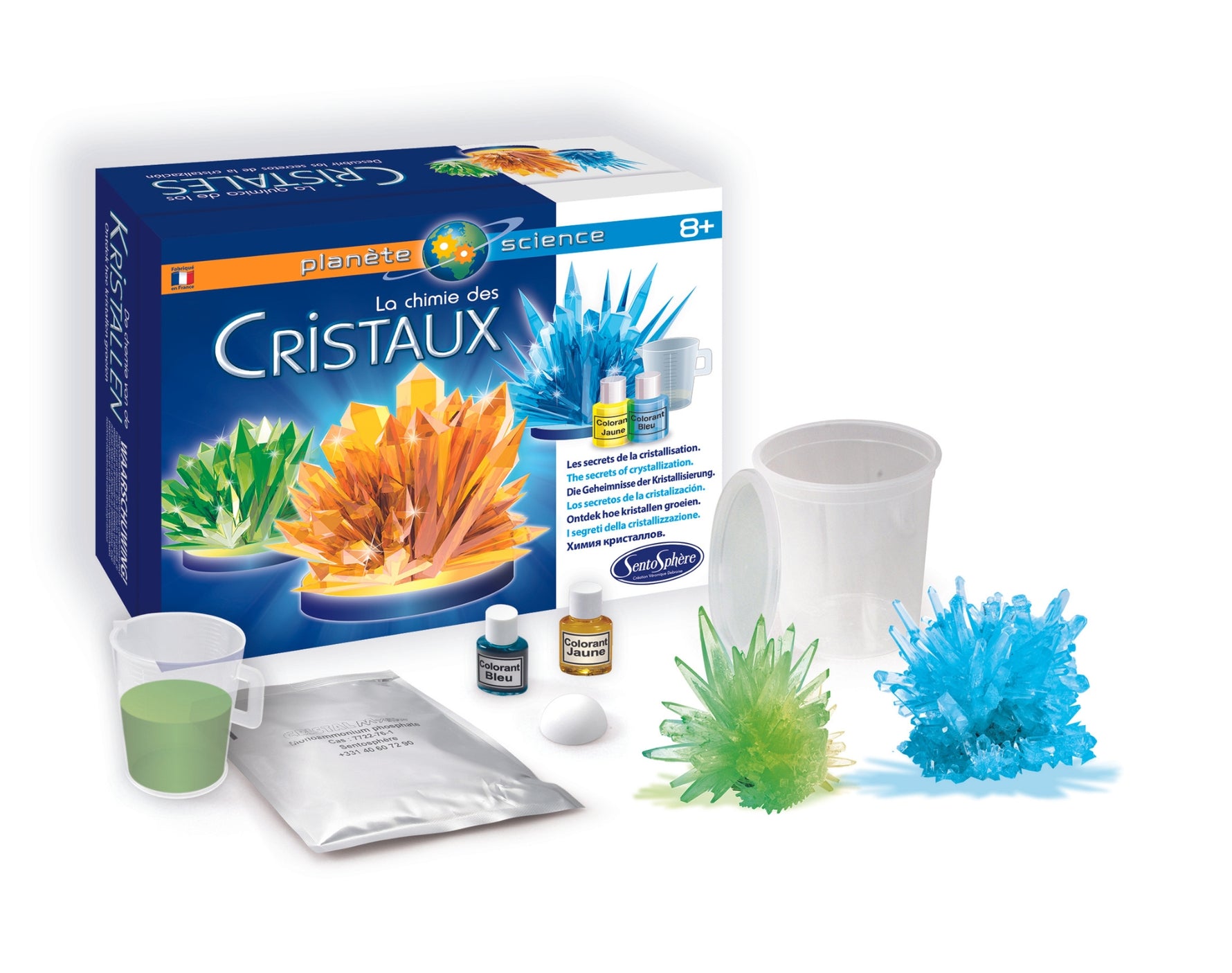 Muškarci su oduvijek bili fascinirani kristalom zbog njegove prozirnosti te oštrih i detaljnih uzoraka. S ove 2 vrećice kristalnog praha od 150 g, ovaj komplet će vam omogućiti uzgoj kristala koji će se pridružiti vašoj kolekciji minerala! Zahvaljujući pokusima prikazanim u ovom priboru, sva će djeca razumjeti fenomen kristalizacije.