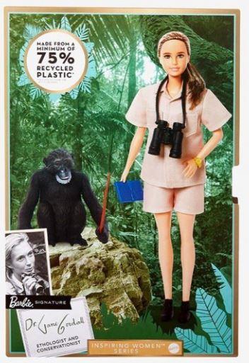 Serija Barbie Inspiring Women slavi nevjerojatne heroine svog vremena: hrabre žene koje su riskirale, promijenile pravila i utrle put generacijama djevojaka da sanjaju još veće snove. U čast desetljeća predanosti, revolucionarnog istraživanja i herojskih postignuća kao borca za zaštitu okoliša, ponašanja životinja i aktivista, Barbie posvećuje posebnu kolekcionarsku lutku dr. Jane Goodall, DBE, osnivačica Instituta Jane Goodall i Glasnik mira Ujedinjenih naroda. Lutka je izrađena od reciklirane plastike. Zajedno s majmunom Davidom Greybeardom, Barbie lutka Dr. Jane Goodall nosi terensku opremu i opremljena je dalekozorom i bilježnicom.