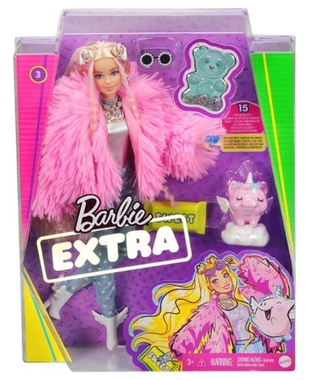 Moda: Što se tiče mode, Barbie® Extra lutke slijede princip 'više je više', s 15 komada uključujući odjeću i modne dodatke, kao i kućnog ljubimca i dodatke za kućne ljubimce. Zabavan i razigran izgled prikazuje njezin samouvjeren stil sa svjetlucavim topom i hlačama s uzorkom zvijezda, nošenim uz ekstra lepršavi ružičasti kaput.