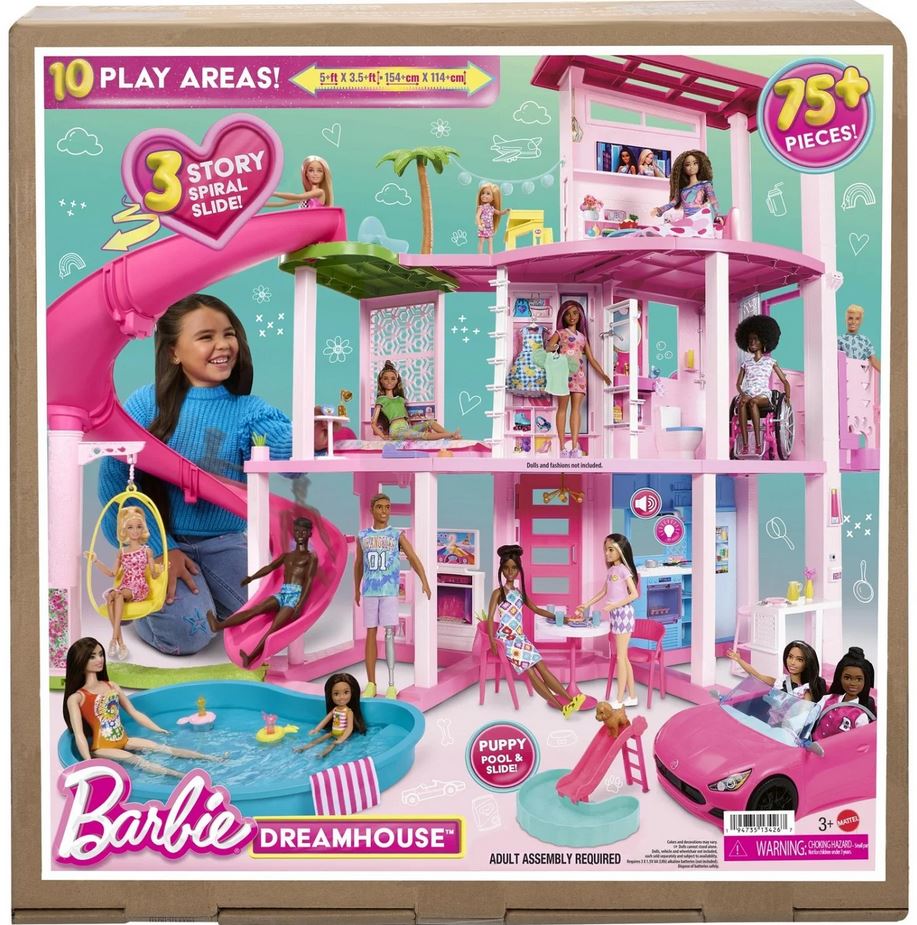 Djeca mogu prirediti vrhunsku zabavu uz bazen uz Barbie® Dreamhouse™! Ova luksuzna kućica za lutke ima najviši tobogan u seriji Barbie® Dreamhouse™ do danas, sa spiralnim dizajnom na tri kata za neograničenu zabavu na suncu. Nudi kružnu igru od 360 stupnjeva sa širokim i prostranim tlocrtom, tri kata i 10 unutarnjih i vanjskih prostora. Set za igru također uključuje više detalja prilagođenih kućnim ljubimcima nego ikad prije, uključujući tobogan za psiće i bazen u kojem se krzneni mogu igrati s lutkom Barbie®! Osim toga, soba na najvišem katu impresionira svojom prenamjenom u spavaću sobu, što omogućuje da Dreamhouse™ spava četiri lutke. S više od 75 dodataka i fleksibilnim prostorima koji udvostručuju zabavu, savršen je dar za djecu od 3 i više godina. Potreban je sastav. Lutke nisu uključene.