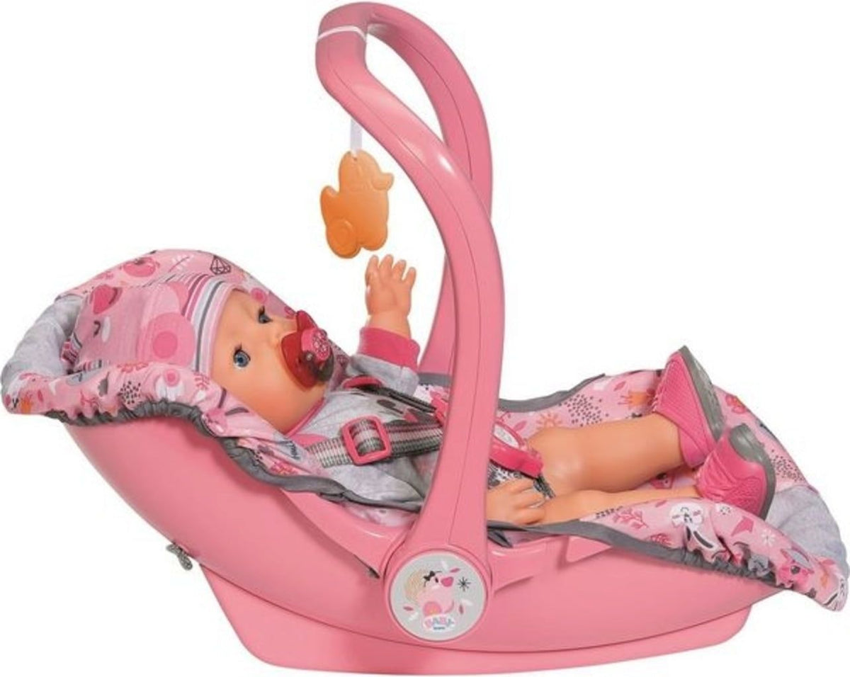 U udobnoj i pažljivo dizajniranoj sigurnosnoj sjedalici BABY born sjedenje će postati njezina nova omiljena aktivnost. Jednostavno promijenite ručku školjke dječje sjedalice i već imate savršeno sjedalo. Na taj način mali istraživač može udobno nadzirati svoju okolinu. Sigurnosni pojas sigurno je drži u sjedalu dok se okreće lijevo-desno i pokazuje na sve oko sebe. Ponekad se nema što vidjeti, a tada se mališan može opustiti i zaspati na leđima ili se igrati s privjeskom patka Berta. Dok BABY born uživa u udobnom ležanju, mama i oči mogu lako nositi ovu laganu sjedalicu. Ako BABY born dosadi, školjka se može koristiti i kao ljuljačka. Ljuljanje je umirujuće i veselo, kao i razigrani materijal omota.